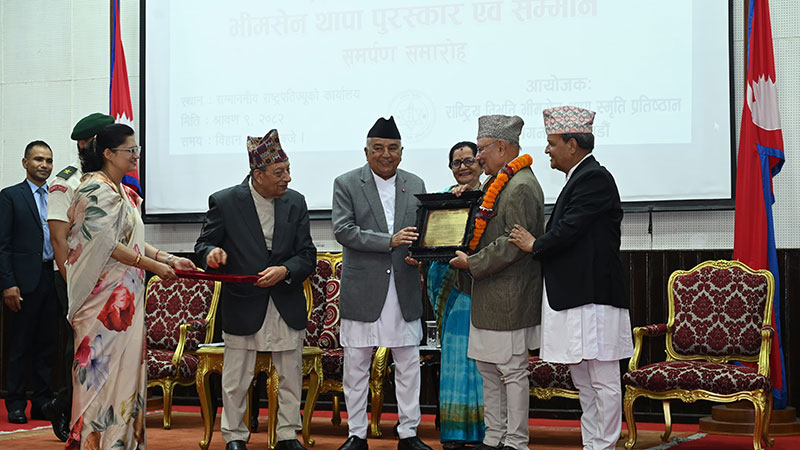 उहाँले भन्नुभयो– ‘उहाँको राष्ट्र«प्रतिको प्रेम, प्रशासनिक क्षमता र राजनीतिक दूरदर्शिताको कारणले नै मुलुक स्वतन्त्र र अटल रुपमा रहन सकेको हो । थापाले आर्थिक, प्रशासनिक, सैनिक, सामाजिक सुधारलगायत राष्ट्रको हित, प्रगति र विकासको लागि गर्नुभएको योगदान सदैव सराहनीय छ । त्यसैले नेपालको इतिहासमा भीमसेन थापाको स्थान उच्च रहेको स्पष्ट हुन्छ ।’ साे क्रममा राष्ट्रपति पाैडेलले कुटनीतिज्ञ भेषबहादुर थापालाई यसवर्षकाे भीमसेन थापा पुरस्कार प्रदान गर्नुभएकाे थियाे ।
