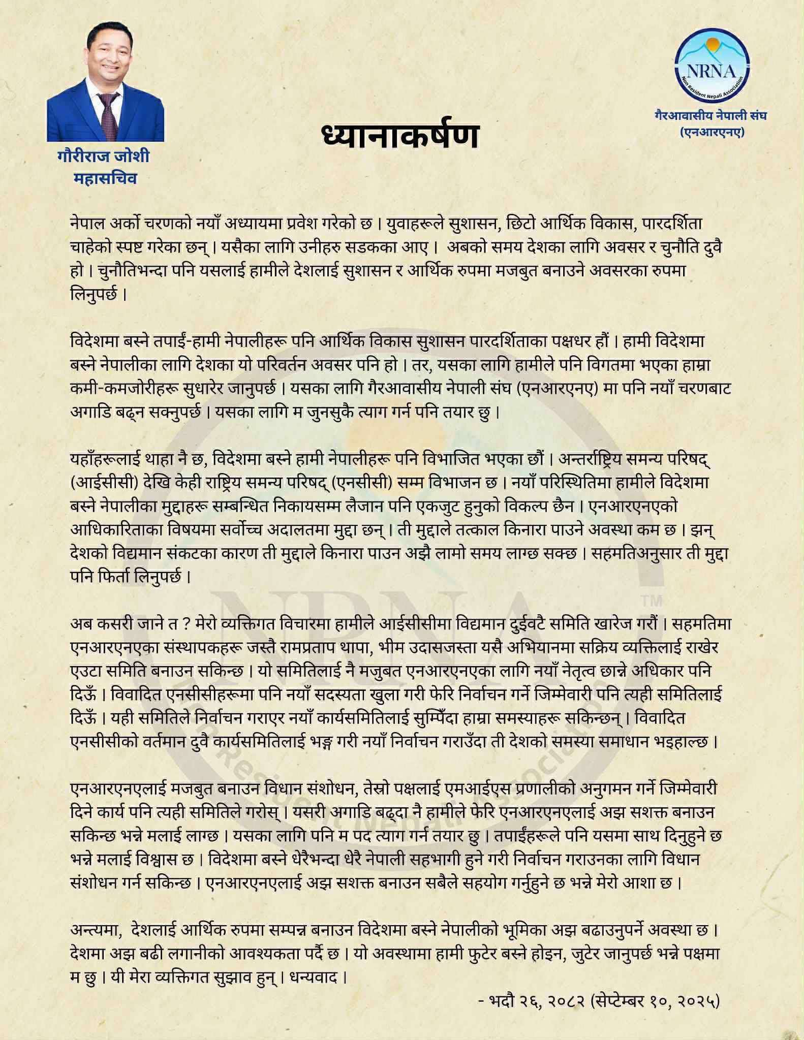 उनले हालै आफ्नो धारणा सार्वजनिक गर्दै विगतका कमी कमजोरीलाई सुधार गर्दै एनआरएनए पनि अब नयाँ चरणबाट अगाडि बढनुपर्ने र यसका लागि आफु जुनसुकै त्याग गर्न पनि तयार रहेको स्पष्ट पारेका छन् । उनले अहिले रहेका एनआरएनएका दुवै कार्यसमिति भङ्ग गर्नुपर्ने प्रस्ताव समेत अगाडि सारेका छन् ।