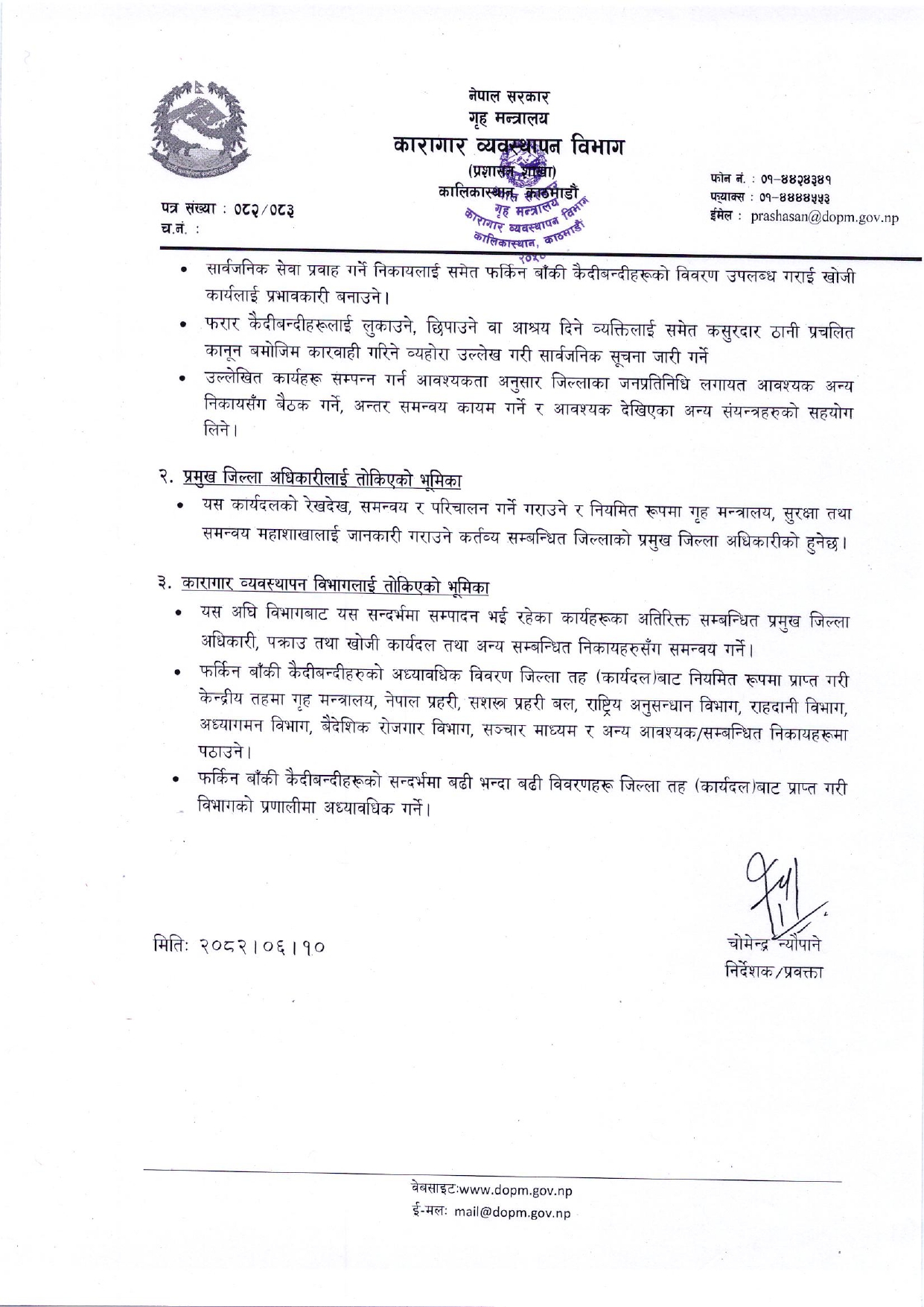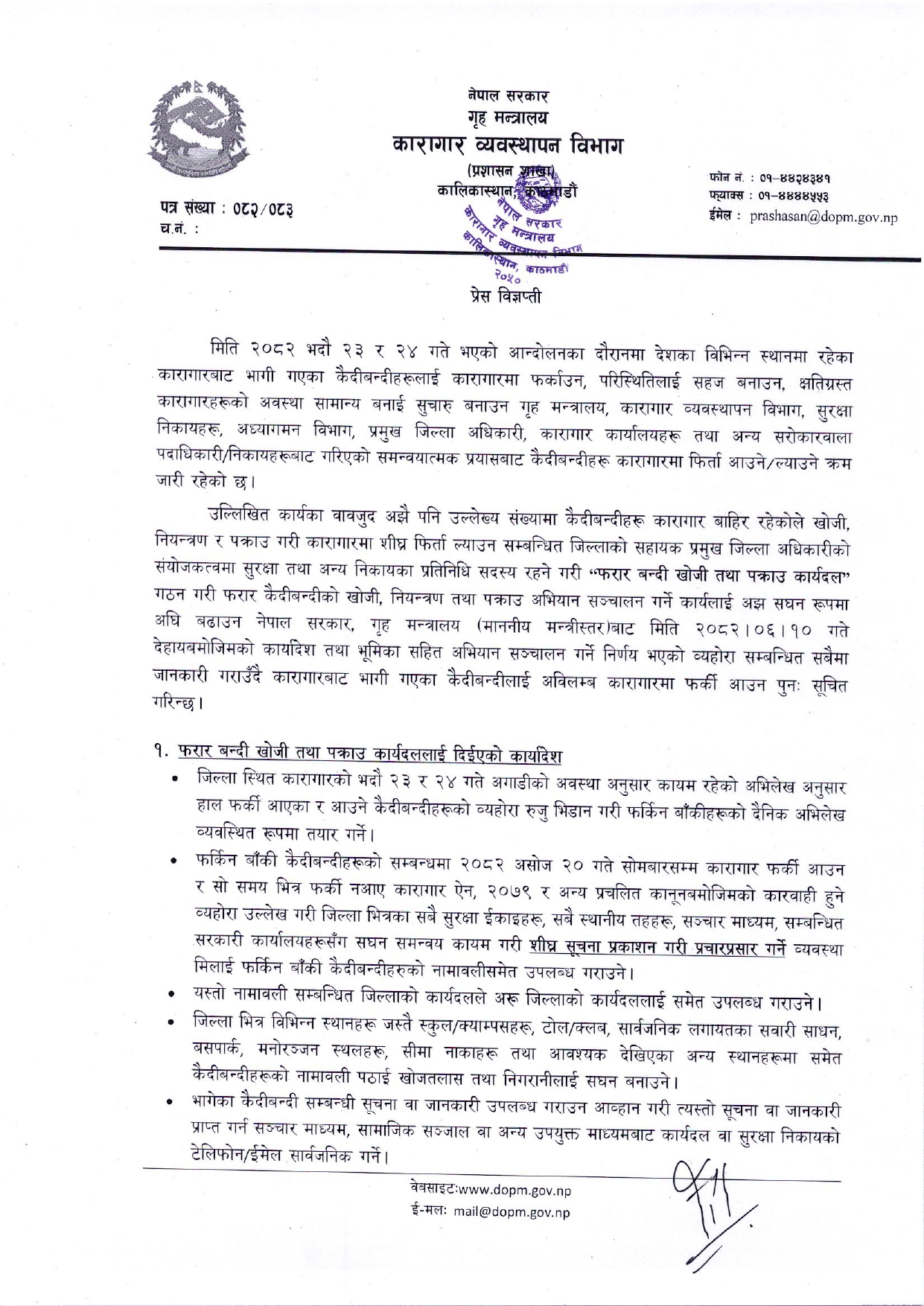 फरार कैदीबन्दीको खोजी, नियन्त्रण तथा पक्राउ अभियानलाई अझ सघन रूपमा अघि बढाउन मन्त्रालयले कार्यदल, सम्बन्धित जिल्लाका प्रमुख जिल्ला अधिकारी र कारागार व्यवस्थापन विभागलाई स्पष्ट कार्यादेशसमेत दिएको विभागद्वारा शुक्रबार जारी विज्ञप्तिमा उल्लेख छ ।