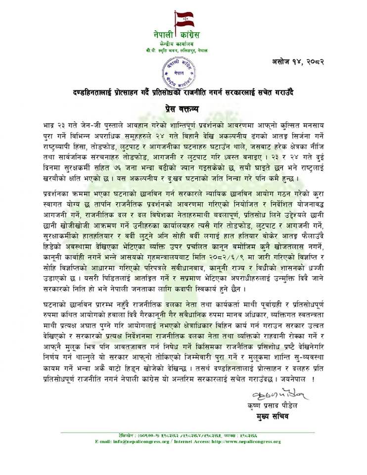 कांग्रेस पार्टी केन्द्रीय कार्यालयका मुख्यसचिव कृष्णप्रसाद पौडेलले आज प्रेस विज्ञप्ति जारी गरी दण्डहीनतालाई प्रोत्साहन र दलहरूप्रति प्रतिशोधपूर्ण राजनीति नगर्न अन्तरिम सरकारलाई ध्यानाकर्षण गराएको हो ।