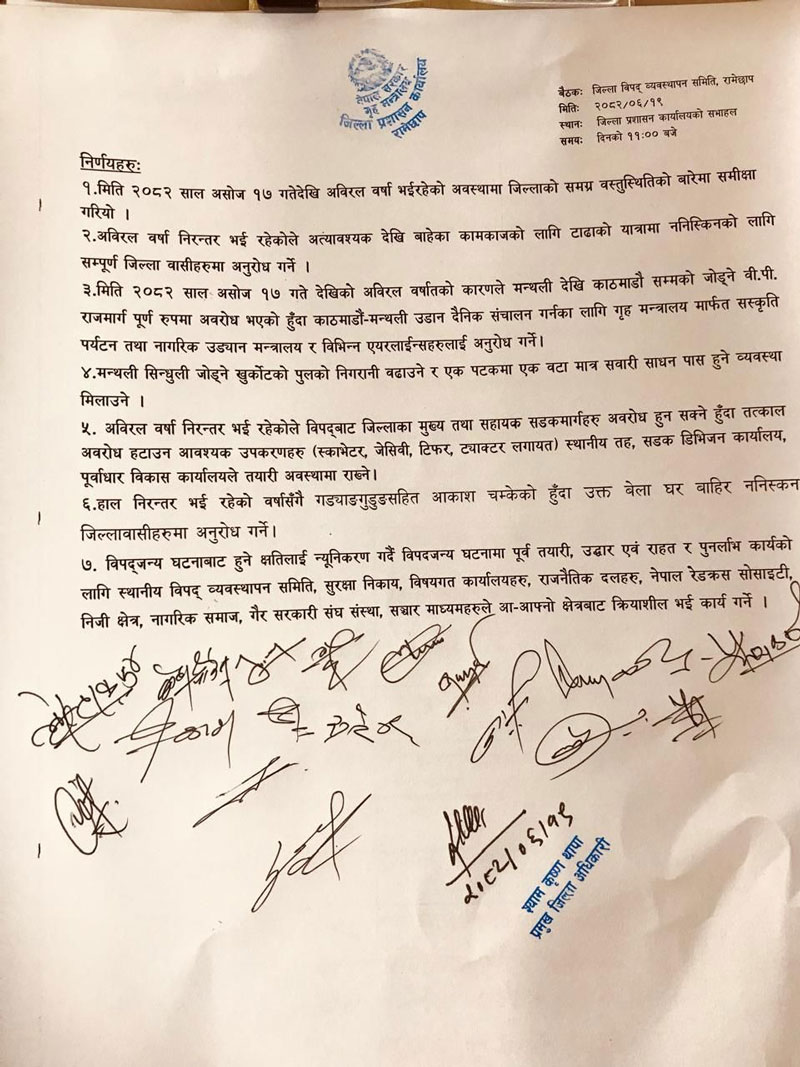 त्यसैगरी, जिल्लाभर लगातार वर्षा भइरहेकाले सर्वसाधारण नागरिकलाई अत्यावश्यक कामबाहेक टाढाको यात्रामा ननिस्कन आग्रह गरिएको छ । विपद् जोखिम बढ्दै गएपछि सडक डिभिजन कार्यालय, स्थानीय तह र पूर्वाधार विकास कार्यालयलाई एक्स्काभेटर, जेसिभी, टिफर र ट्र्याक्टरजस्ता उपकरण तयारी अवस्थामा राख्न पनि निर्णय गरिएको छ ।