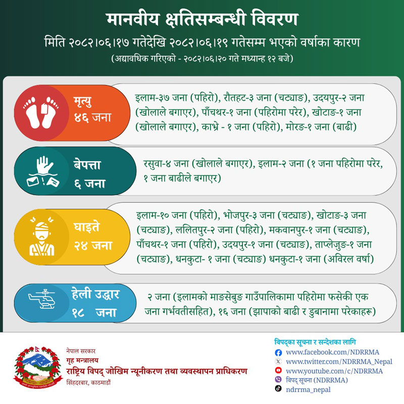 रौतहटमा चट्याङ लागेर तीन जनाको मृत्यु भएको छ भने उदयपुरमा खोलाले बगाउँदा दुई जनाको ज्यान गएको छ । पाँचथर, खोटाङ, काभ्रे, मोरङ, रसुवा, भोजपुर, ललितपुर, मकवानपुर, ताप्लेजुङ र धनकुटाजस्ता जिल्लाहरूमा पनि विभिन्न कारणले मानवीय क्षति भएको छ ।