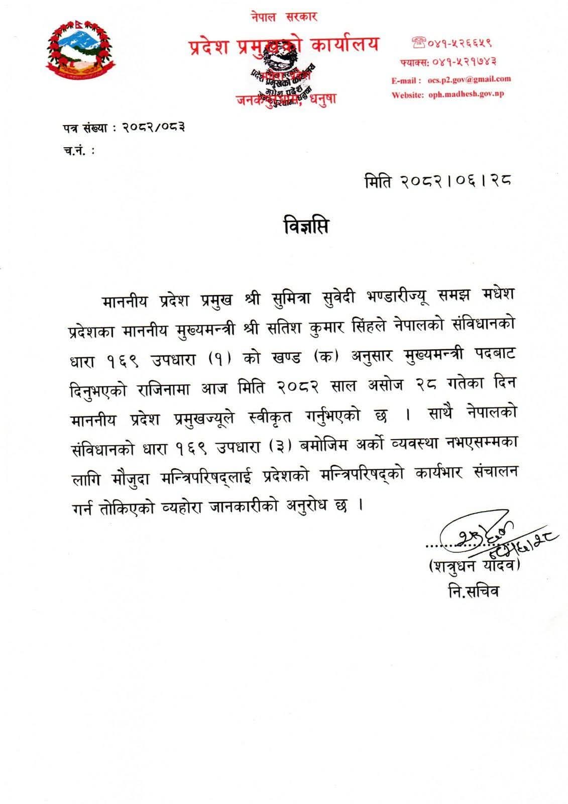 आज प्रदेश प्रमुखको कार्यालयले विज्ञप्ति जारी गरी नेपालको संविधानको धारा १६९ उपधारा (१) को खण्ड (क) अनुसार सिंहले मुख्यमन्त्री पदबाट दिएको राजीनामा प्रदेश प्रमुखले स्वीकृत गरेको जानकारी दिएको हो ।