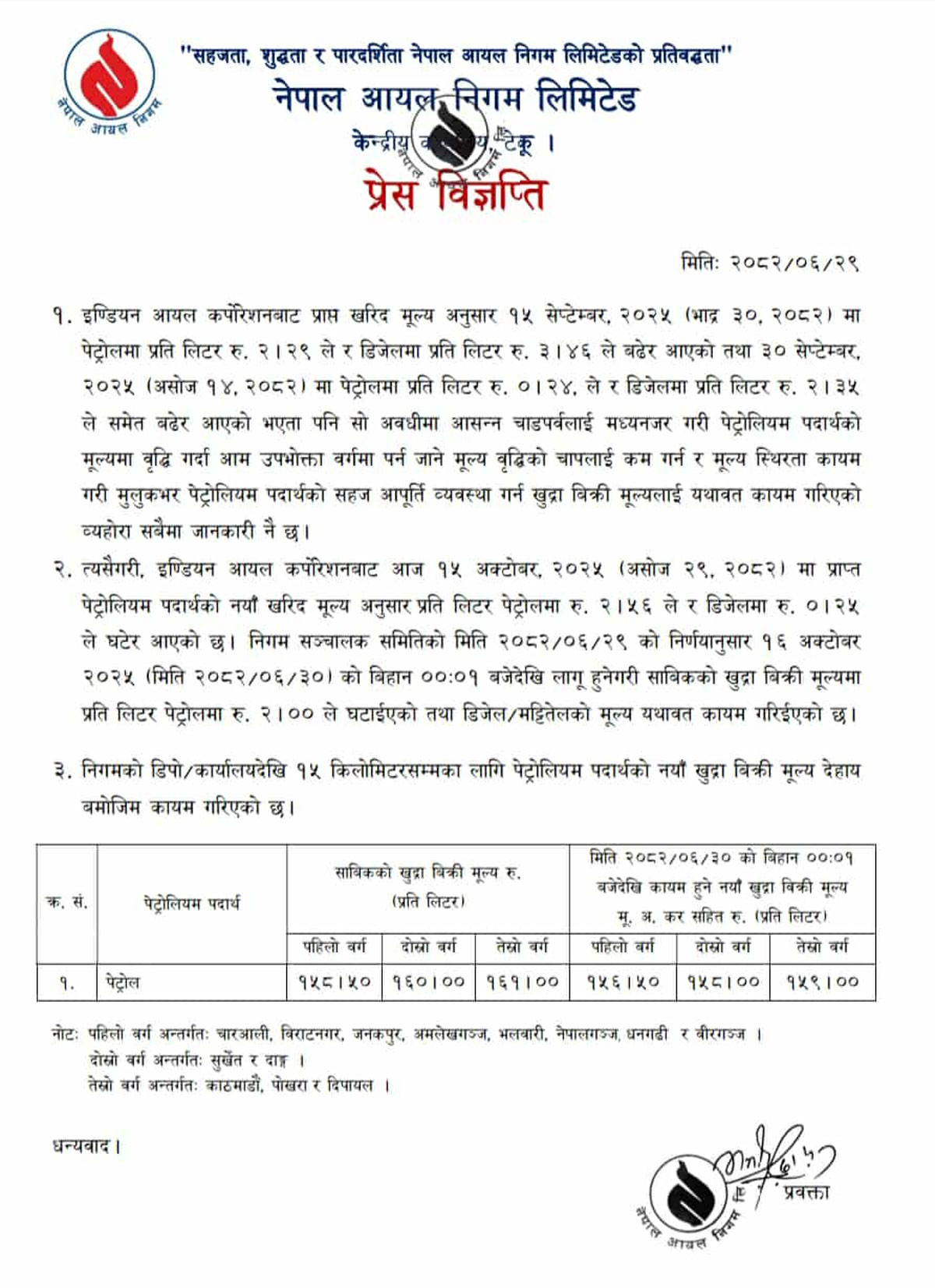 निगमका अनुसार डिजेल, मट्टीतेल र हवाई इन्धनको मूल्य भने यथावत् छ।