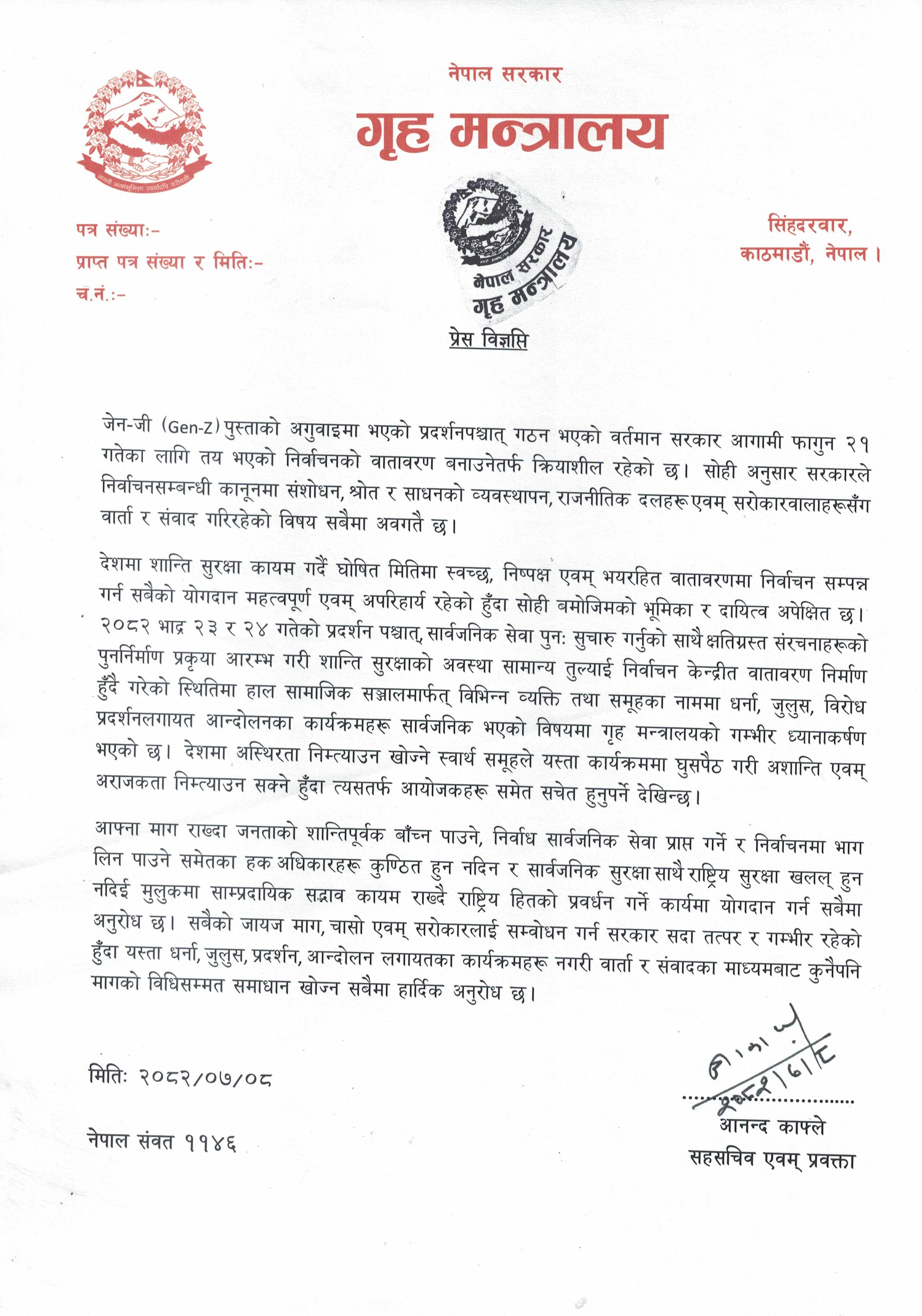 ‘जायज माग, चासो एवं सरोकारलाई सम्बोधन गर्न सरकार सदा तत्पर छ, धर्ना, जुलुस, प्रदर्शन, आन्दोलन लगायतका कार्यक्रमहरू नगरी वार्ता र संवादका माध्यमबाट कुनै पनि मागको विधिसम्मत समाधान खोज्न सबैमा हार्दिक अनुरोध छ, जारी विज्ञप्तिमा भनिएको छ ।