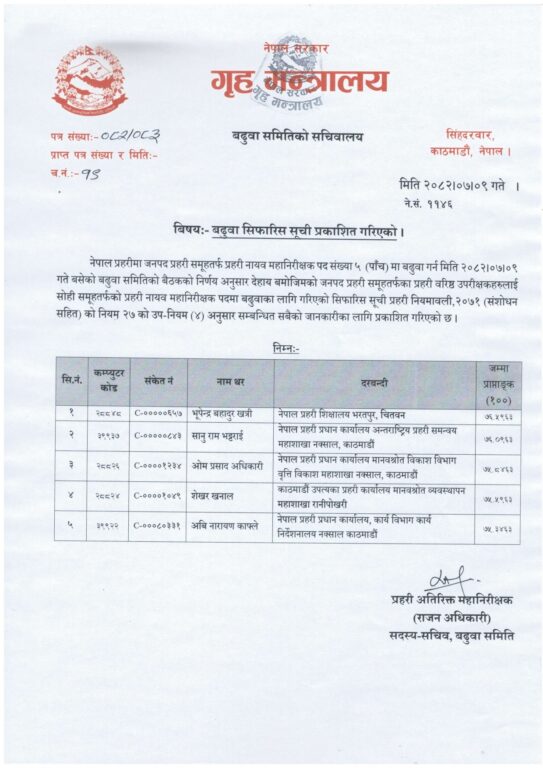 एसएसपीहरु भुपेन्द्र खत्री, सानुराम भट्टराई, ओम अधिकारी, शेखर खनाल र अविनारायण काफ्ले सिफारिस भएको गृहमन्त्रालयले जनाएको छ।