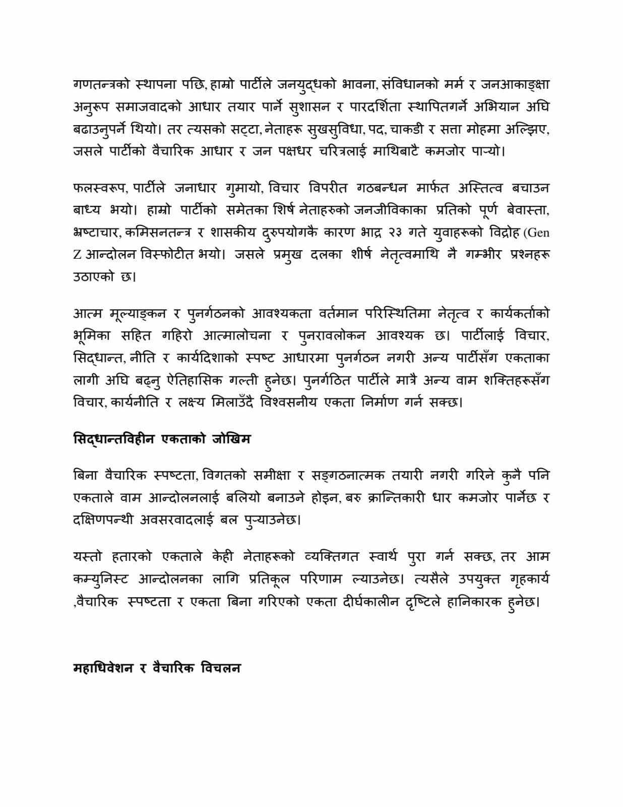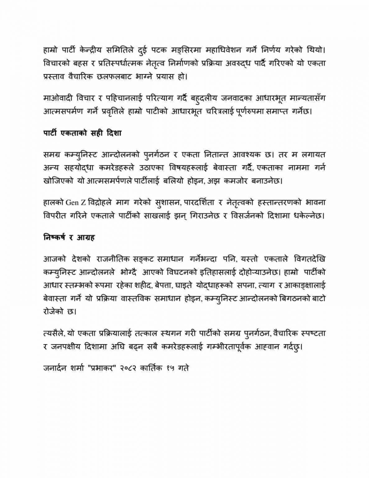 पेरिसडाँडामा बसेको सचिवालय बैठकमा लिखित रूपमा आफ्नो धारणा राख्दै एकता प्रक्रिया छाडेर पार्टी पुनर्गठनमा गर्नुपर्ने बताए।