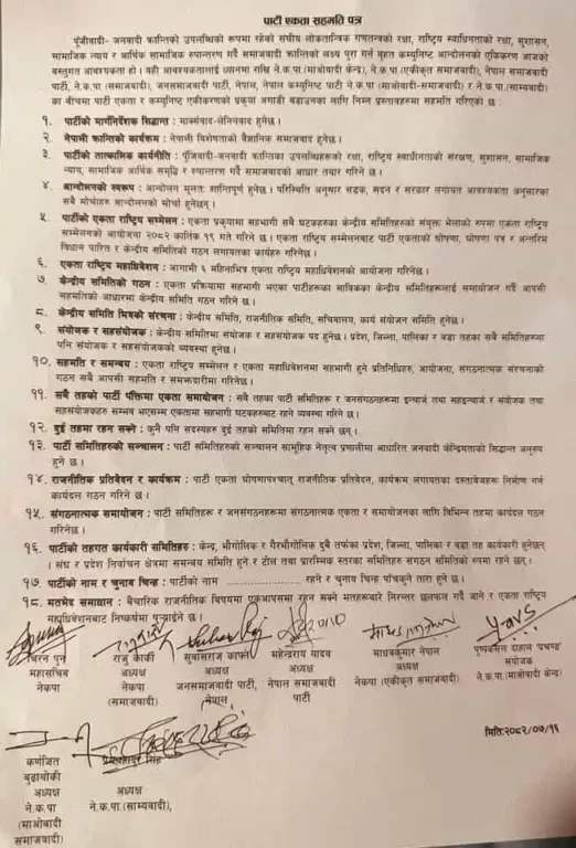 काठमाडौँ। नेकपा माओवादी केन्द्र र नेकपा एकीकृत समाजवादीसहित ८ वटा दलबीच पार्टी एकता गर्ने सहमतिमा हस्ताक्षर भएको छ।