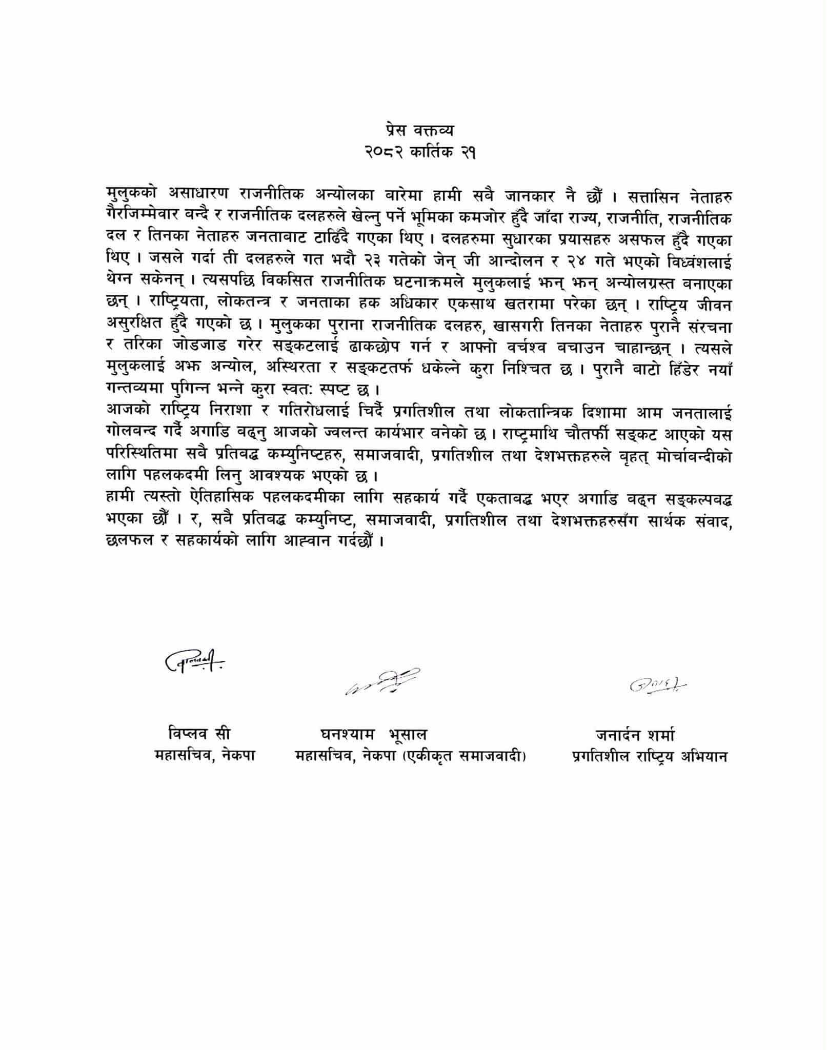 शुक्रबार जारी संयुक्त प्रेस विज्ञप्तिमा तिनै नेताले राष्ट्रियता, लोकतन्त्र र जनअधिकारहरू गम्भीर संकटमा परेको निष्कर्ष निकाल्दै, वाम, समाजवादी र प्रगतिशील शक्तिहरूबीच बृहत मोर्चा निर्माणका लागि पहल गर्ने घोषणा गरेका हुन्।