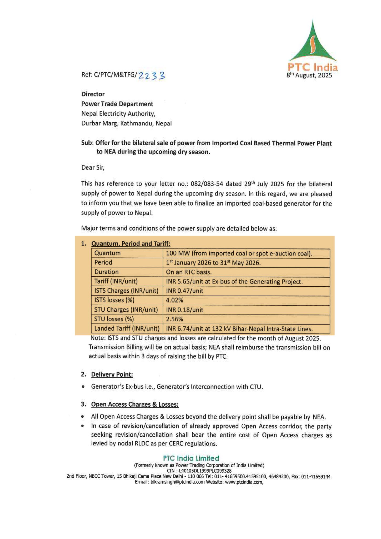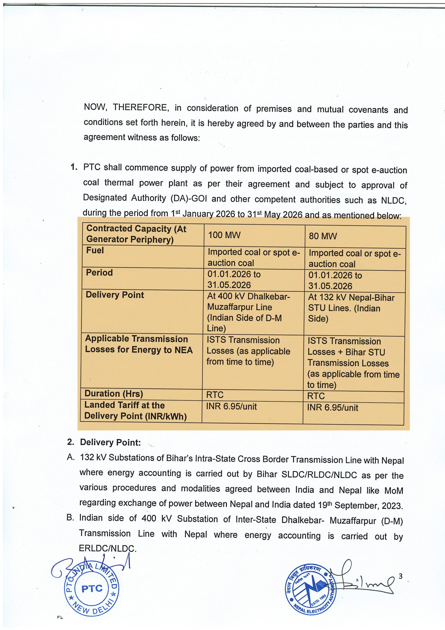 सम्झौता अनुसार नेपालले आगामी जनवरीदेखि मेसम्म भारतबाट १ सय ८० मेगावाट विद्युत् आयात गर्नेछ। तर, सम्झौतामा ढल्केबर–मुजफ्फरपुर ४०० केभी लाइनबाट आउने बिजुलीमा लागू नहुने राज्य प्रसारण शुल्क र चुहावट पनि जोडिएको छ, जसले अनावश्यक रूपमा प्राधिकरणलाई घाटा पुर्याएको छ।