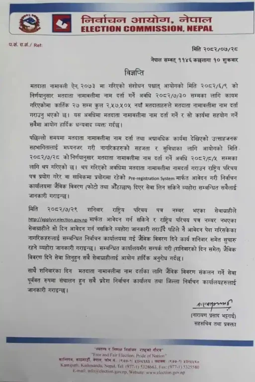 पछिल्लो समयमा मतदाता नामावलीमा नाम दर्ता तथा अद्यावधिक कार्यमा देखिएको उत्साहजनक सहभागितालाई मध्यनजर गरी नागरिकहरूको सहजता र सुविधाका लागि आयोगको शुक्रबारको निर्णयानुसार मतदाता नामावलीमा नाम दर्ता गर्ने अवधि आगामी मंसिर ५ गते सम्मका लागि थप गरेको छ।