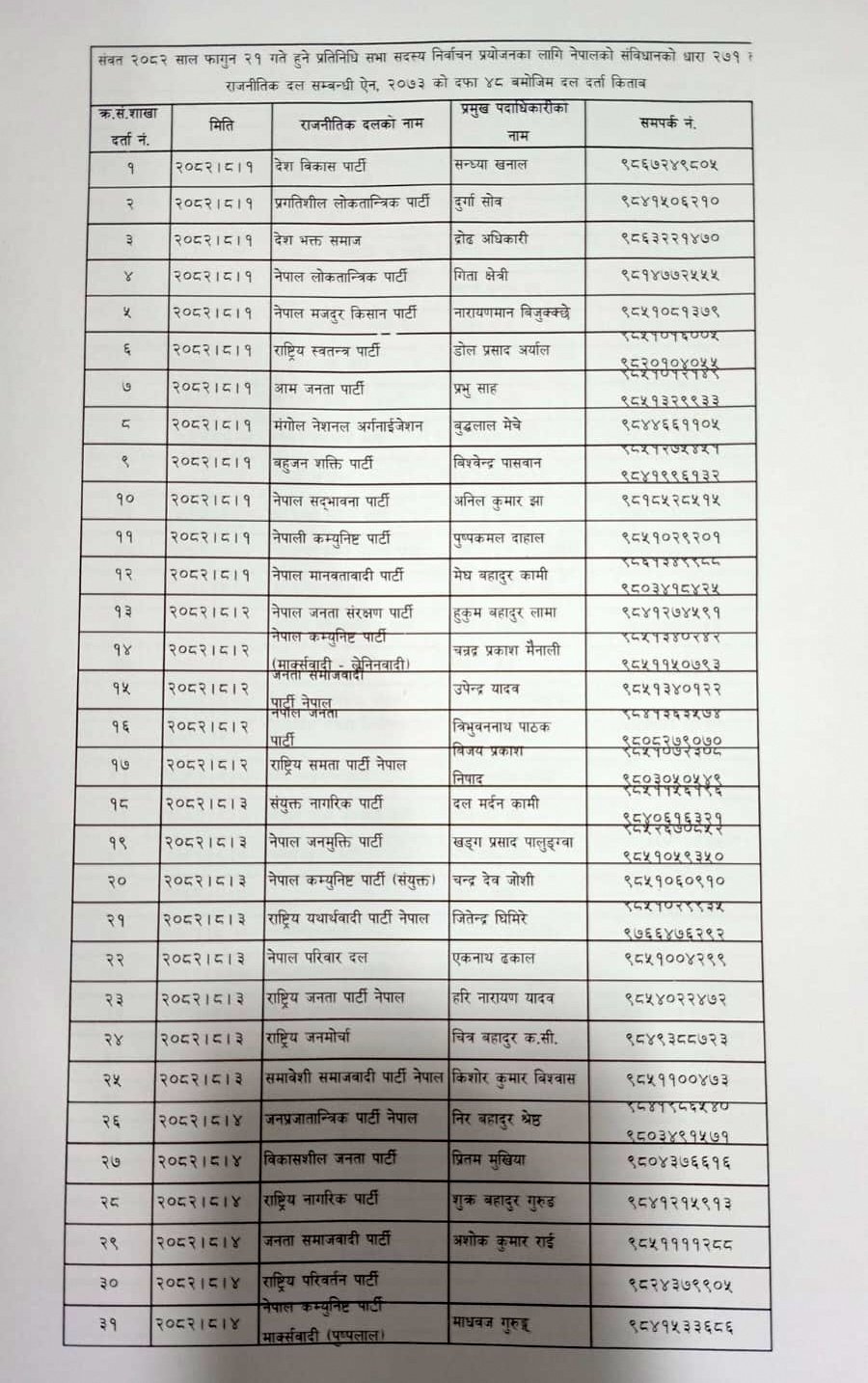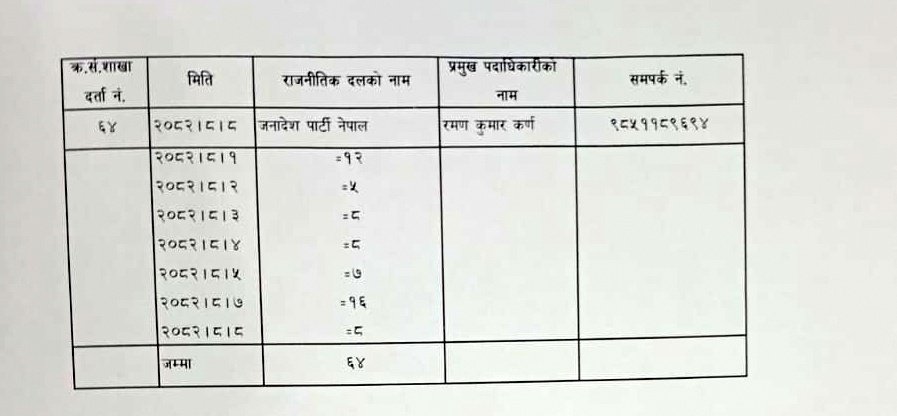आयोगका अनुसार मंसिर १ गते १२, २ गते ५, ३ र ८ गते ८–८, ५ गते ७, ७ गते १६ र ८ गते ८ दल दर्ता भएका छन् ।