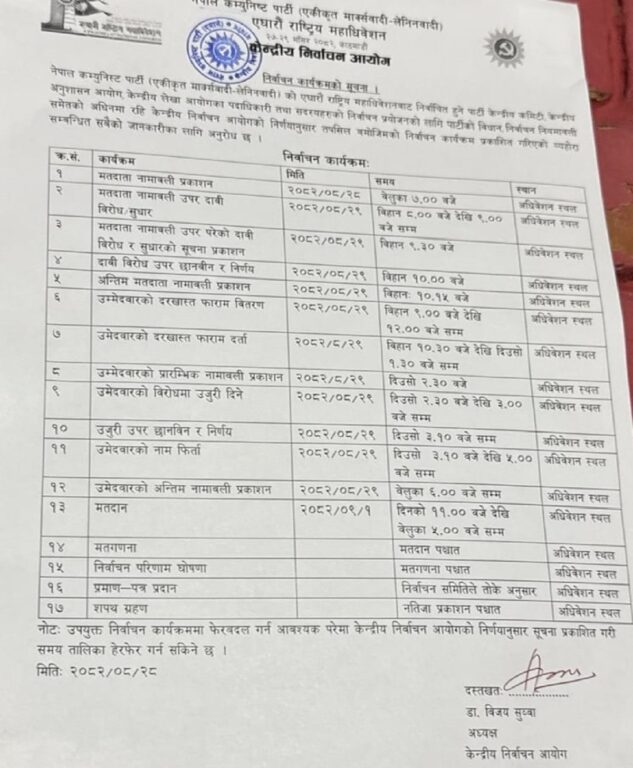 यसअघि एमालेले मंसिर २९ गते महाधिवेशन सक्ने कार्यतालिका ल्याएको थियो । आइतबार प्रकाशित कार्यतालिकाअनुसार भने पुस २ गते मात्रै सकिने भएको छ । एमाले केन्द्रीय निर्वाचन आयोगले सार्वजनिक गरेको तालिकाअनुसार आइतबार बेलुका मतदाता नामावली प्रकाशन हुनेछ ।