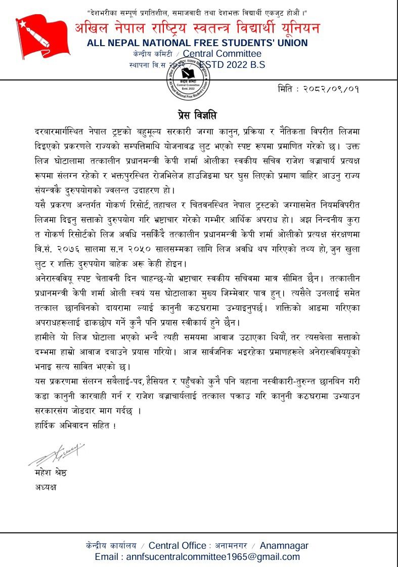 विज्ञप्तिमा गोकर्ण रिसोर्टको लिज अवधि नसकिँदै २०७६ सालमा थप अवधि बढाइएको घटनालाई विशेष रूपमा उठाइएको छ । संगठनका अनुसार तत्कालीन प्रधानमन्त्री ओलीको प्रत्यक्ष संरक्षणमा २०५० सालसम्मका लागि लिज थपिनु शक्ति दुरुपयोगको चरम रूप हो । अनेरास्ववियूले यो प्रकरण स्वकीय सचिवको व्यक्तिगत गलतिमा सीमित नरही नीतिगत तहमै भएको भ्रष्टाचार भएको दाबी गरेको छ ।