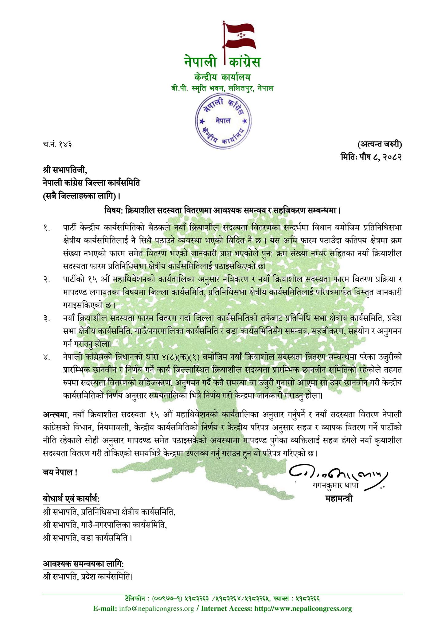 काठमाडौं । नेपाली कांग्रेसका महामन्त्री गगन थापाले ‘क्रियाशील सदस्यता वितरणमा आवश्यक समन्वय र सहजीकरण’ गर्न जिल्ला सभापतिहरूलाई ‘चारबुँदे’ निर्देशन दिएका छन्।