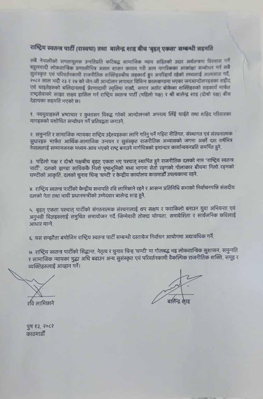 सहमतिपत्रमा रवि लामिछाने र बालेन्द्र शाहले हस्ताक्षर गरेका छन् । एकीकरणपछि पार्टीको नाम राष्ट्रिय स्वतन्त्र पार्टी र चुनाव चिह्न घण्टी रहने भएको छ ।