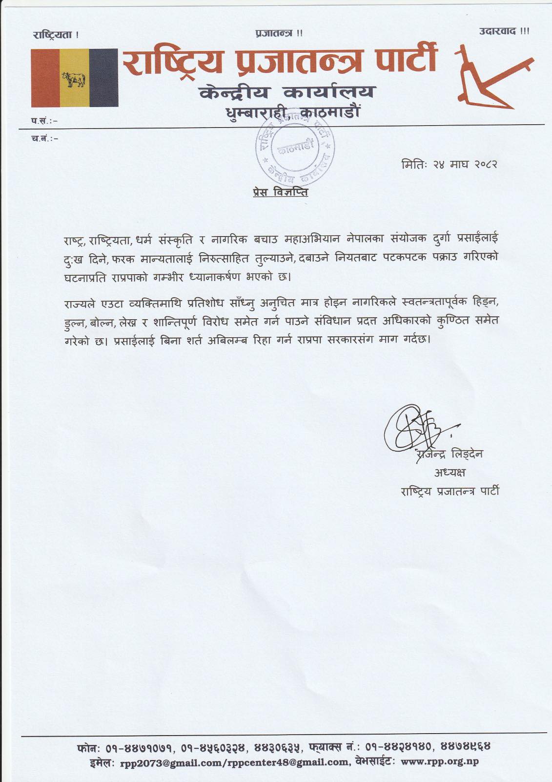 ‘राष्ट्र, राष्ट्रियता, धर्म संस्कृति र नागरिक बचाउ महाअभियान नेपालका संयोजक दुर्गा प्रसाईंलाई दुःख दिने, फरक मान्यतालाई निरुत्साहित तुल्याउने, दबाउने नियतबाट पटक–पटक पक्राउ गरिएको घटनाप्रति राप्रपाको गम्भीर ध्यानाकर्षण भएको छ,’ लिङ्देनद्वारा जारी विज्ञप्तिमा उल्लेख छ, ‘राज्यले एउटा व्यक्तिमाथि प्रतिशोध साँध्नु अनुचित मात्र होइन नागरिकले स्वतन्त्रतापूर्वक हिँड्न, डुल्न, बोल्न, लेख्न र शान्तिपूर्ण विरोध समेत गर्न पाउने संविधान प्रदत्त अधिकारको कुण्ठित समेत गरेको छ । प्रसाईंलाई विनासर्त अबिलम्ब रिहा गर्न राप्रपा सरकारसँग माग गर्दछ ।’