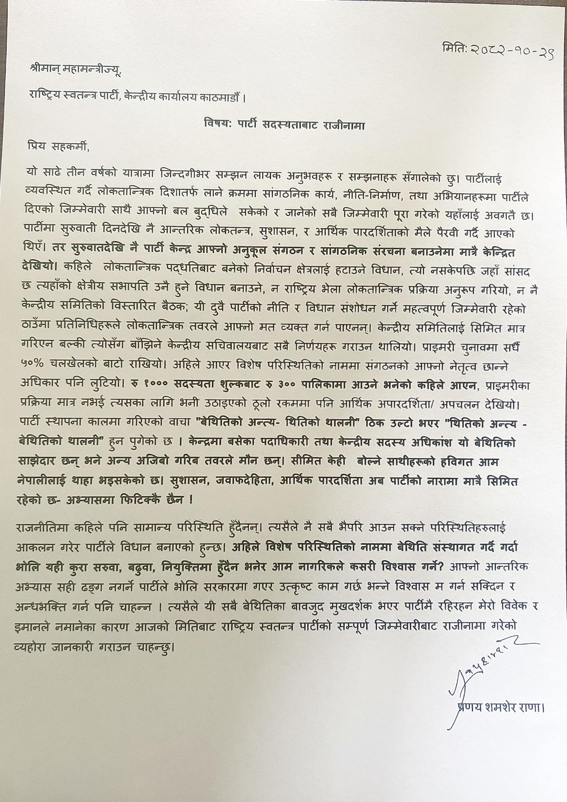 राणाले राजीनामा पत्र नै सार्वजनिकसमेत गरेका छन् । उनको राजीनामा पत्रमा आन्तरिक लोकतन्त्र र सुशासनको विषयमा बहस भए पनि पार्टी केन्द्रले ध्यान नदिएको उल्लेख गरिएको छ ।
