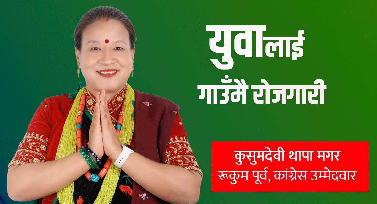 रूकुम । एकमात्र निर्वाचन क्षेत्र रहेको रूकुम पूर्वमा नेपाली कांग्रेसबाट प्रतिनिधि सभा सदस्यमा प्रत्यक्षबाट उम्मेदवारी दिएकी छिन् कुसुमदेवी थापा मगरले । ०२९ भदौ २९ गते पर्वतमा जन्मिएकी कुसुम रूकुमको पुथा उत्तरगंगा गाउँपालिका–१० की स्थायी बासिन्दा हुन् ।