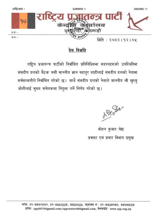 बिहीबार बसेकाे राप्रपा संसदीय दलको बैठकले शाहीलाई दलको नेता चयन गरेको हो ।