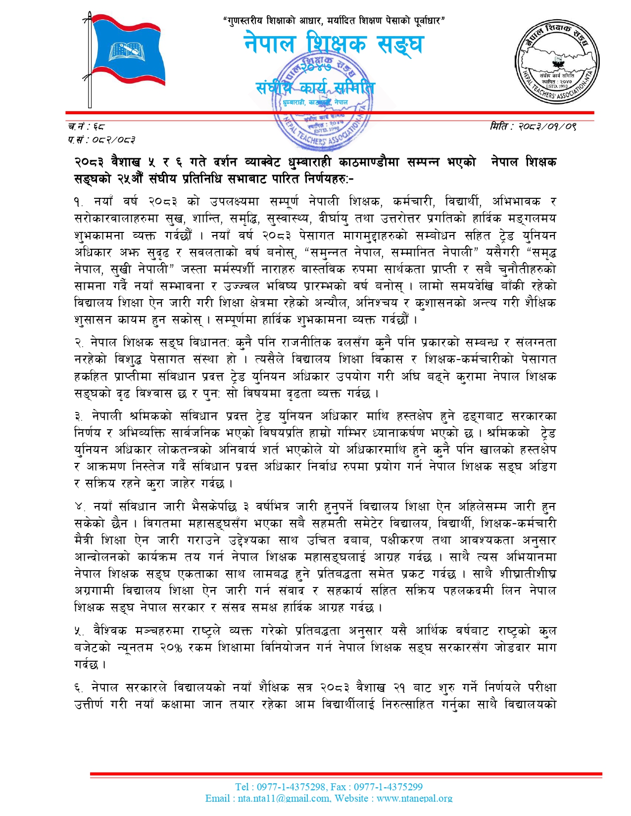 काठमाडौँ । नेपाल शिक्षक संघको २५औँ संघीय प्रतिनिधिसभा यही वैशाख ५ र ६ गते धुम्बाराहीमा सम्पन्न भएको छ। सभाले विभिन्न नौ बुँदे निर्णय पारित गर्दै शिक्षा क्षेत्र सुधार, शिक्षक कर्मचारीको अधिकार सुनिश्चितता तथा विद्यालय शिक्षा ऐन शीघ्र जारी गर्न सरकारसँग माग गरेको छ।