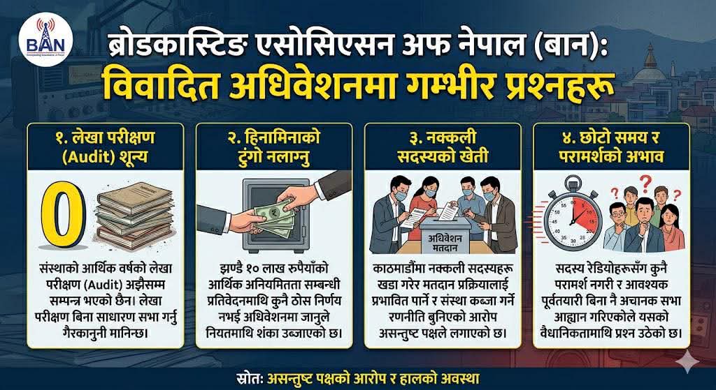 आर्थिक अनियमितता र साइबर क्राइमसहितका गम्भीर आरोप खेपिरहेका पदाधिकारीहरूले अहिले संस्थाको लेटरप्याड दुरुपयोग गर्दै अनधिकृत रूपमा महाधिवेशनको भ्रम फैलाइरहेका छन्। उता* संस्थाका अध्यक्ष कुमार भट्टराईले भने वैशाख २४ र २५ गते पोखरामा महाधिवेशन गर्ने निर्णय भइसकेको जानकारी दिएका छन् ।