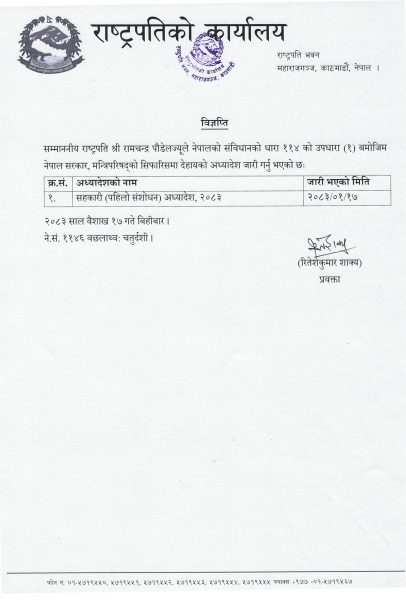 काठमाडौँ । राष्ट्रपति रामचन्द्र पौडेलले सहकारीसम्बन्धी अध्यादेश जारी गरेका छन्। राष्ट्रपति कार्यालयका प्रवक्ता रितेशकुमार शाक्यका अनुसार सरकारले सिफारिस गरेको आधारमा सहकारी (पहिलो संशोधन) अध्यादेश, २०८३ जारी गरिएको हो।